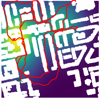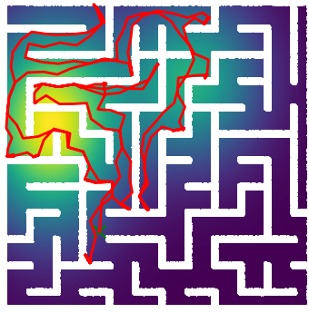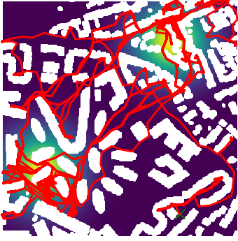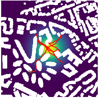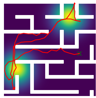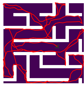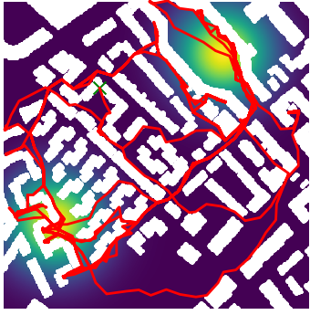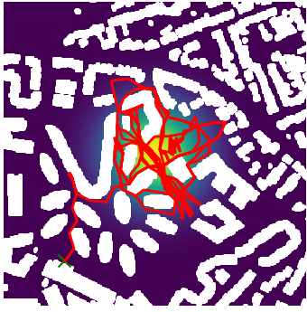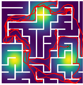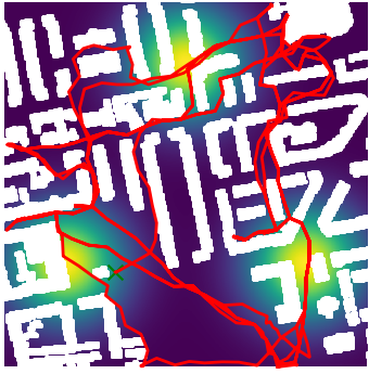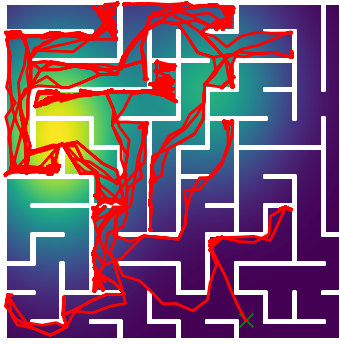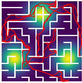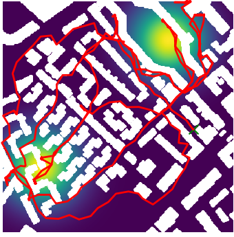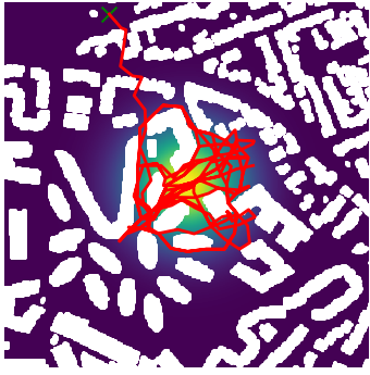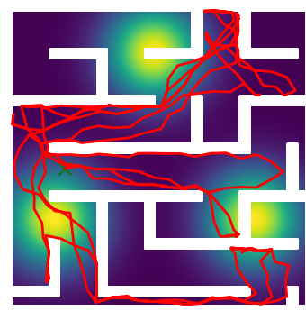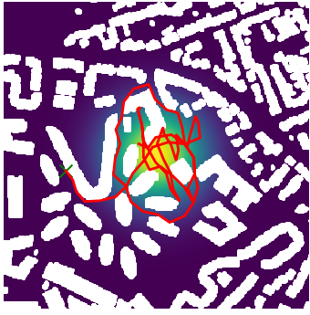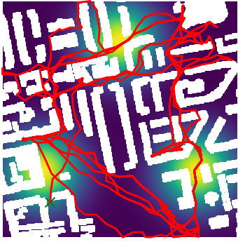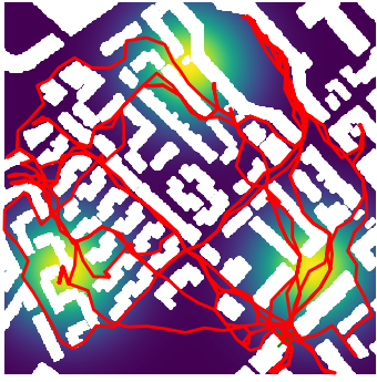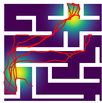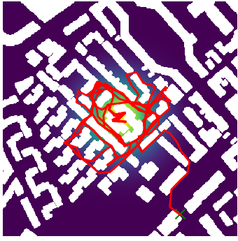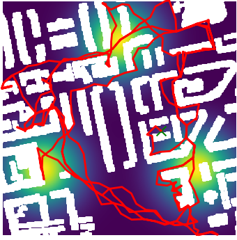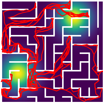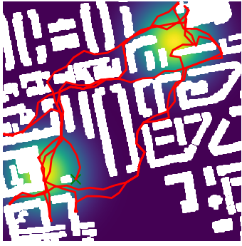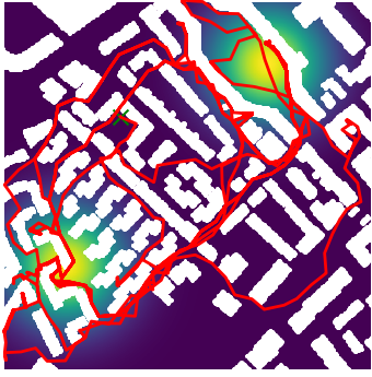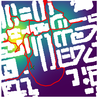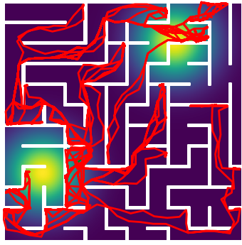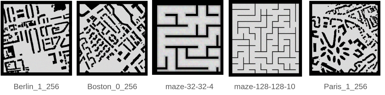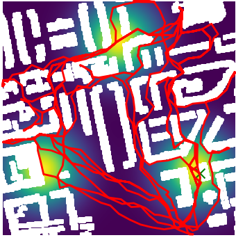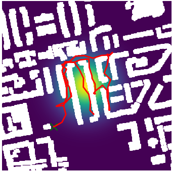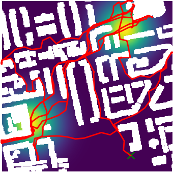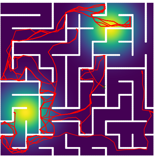 Here we demonstrate output trajectories given by GESCE when executed on MAPF benchmark maps referenced in Stern et. Al.. We use maps “Berlin_1_256”, “Boston_0_256”, “maze-32-32-4”, “maze-128-128-10” and “Paris_1_256” for their high clutter value. These maps are shown in Figure 1. Along with that, we use 5 information maps as shown in Figure 2. Then tests are conducted on the five aforementioned obstacle maps and information maps, performing five simulations for each scenario with randomly chosen starting locations. Resulting trajectories, marked in red, are shown in grid below in Figure 3,4,5,6 and 7. Each line indicates a different starting location for the robot.