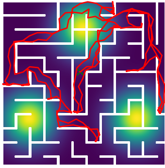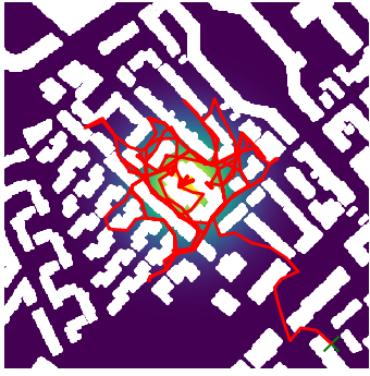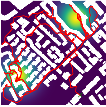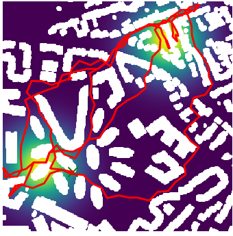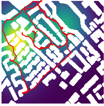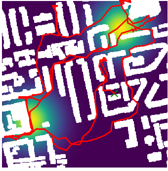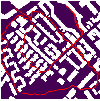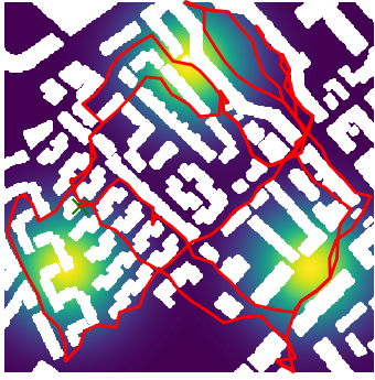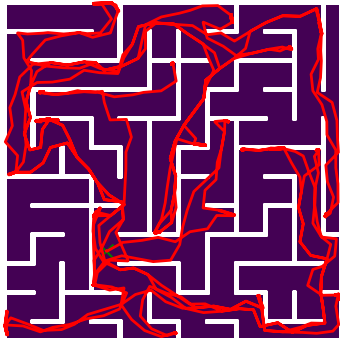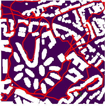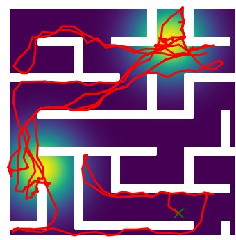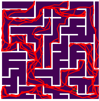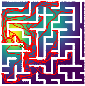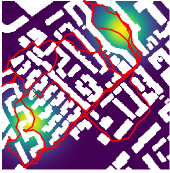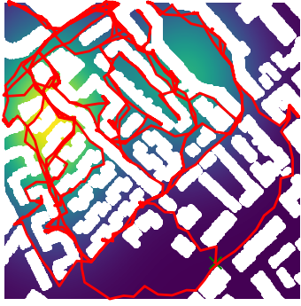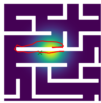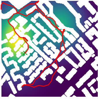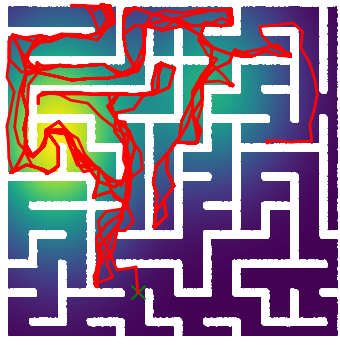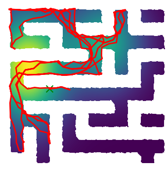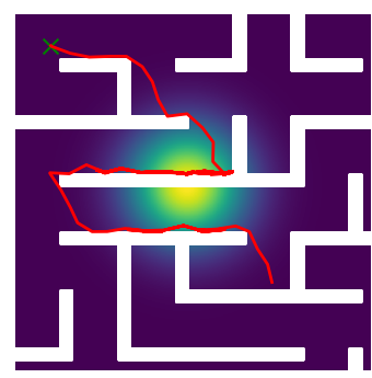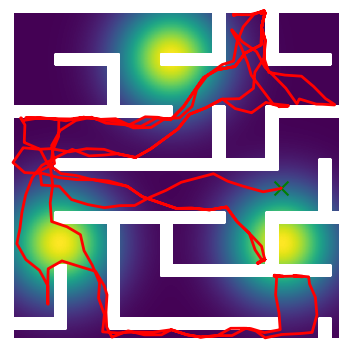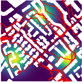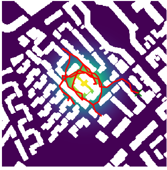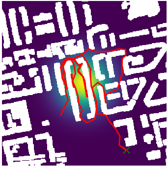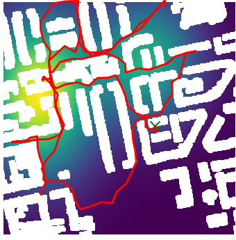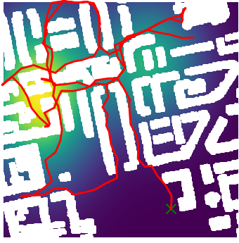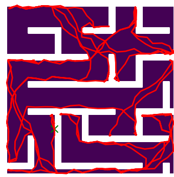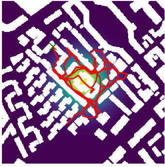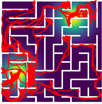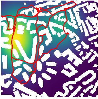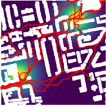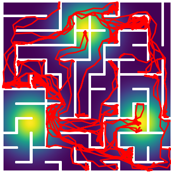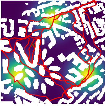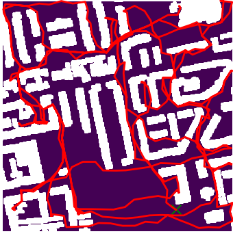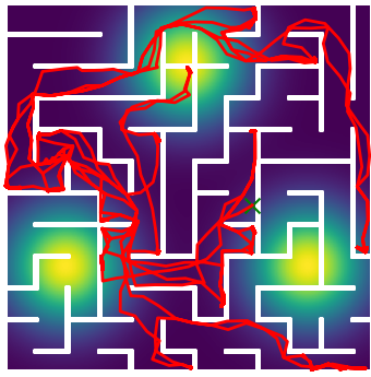 Here we demonstrate output trajectories given by GESCE when executed on MAPF benchmark maps referenced in Stern et. Al.. We use maps “Berlin_1_256”, “Boston_0_256”, “maze-32-32-4”, “maze-128-128-10” and “Paris_1_256” for their high clutter value. These maps are shown in Figure 1. Along with that, we use 5 information maps as shown in Figure 2. Then tests are conducted on the five aforementioned obstacle maps and information maps, performing five simulations for each scenario with randomly chosen starting locations. Resulting trajectories, marked in red, are shown in grid below in Figure 3,4,5,6 and 7. Each line indicates a different starting location for the robot.