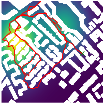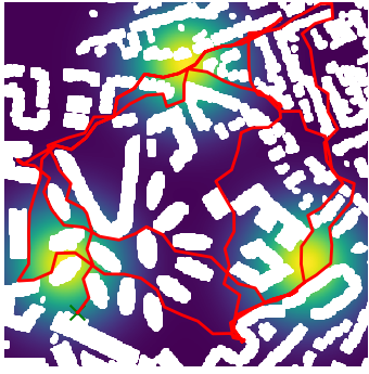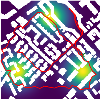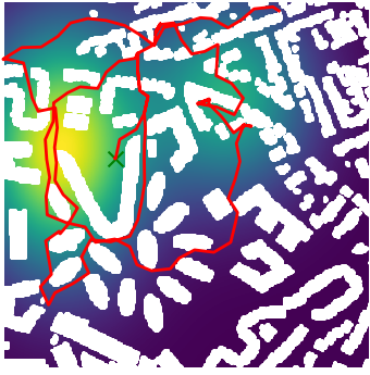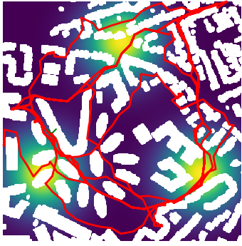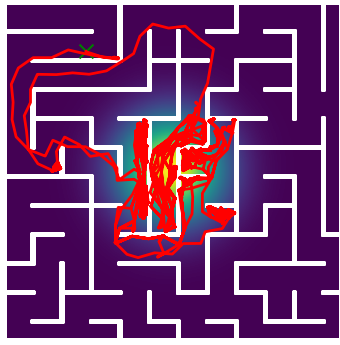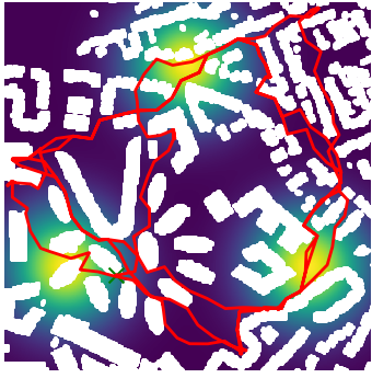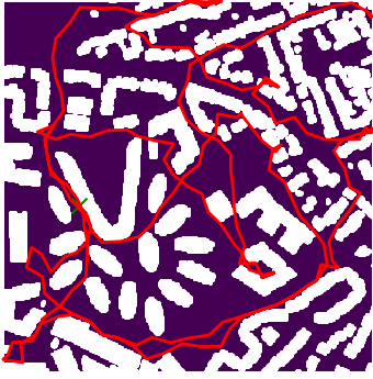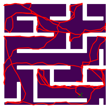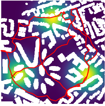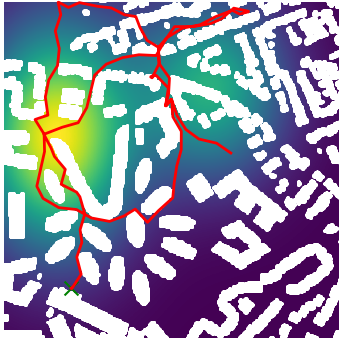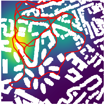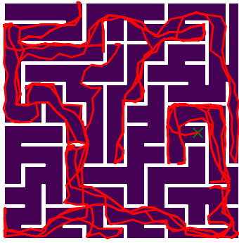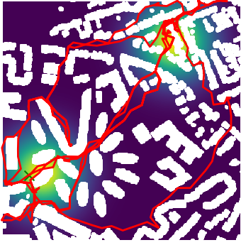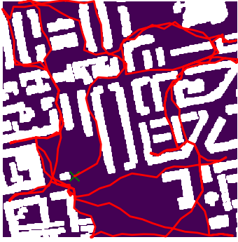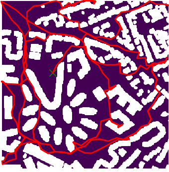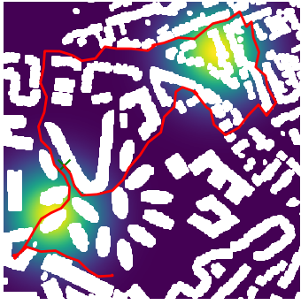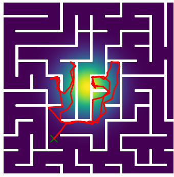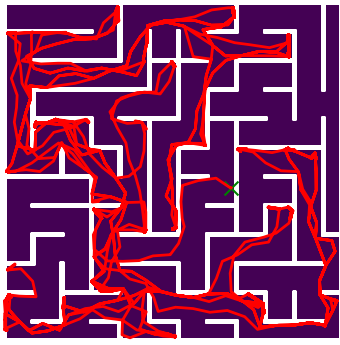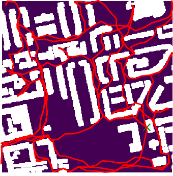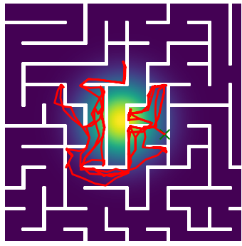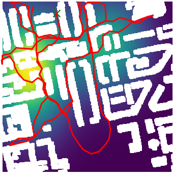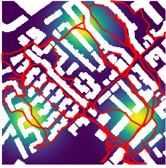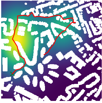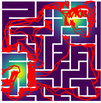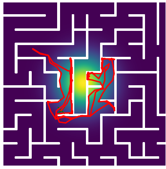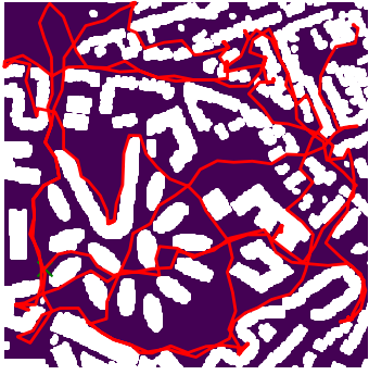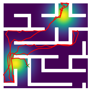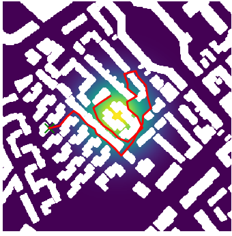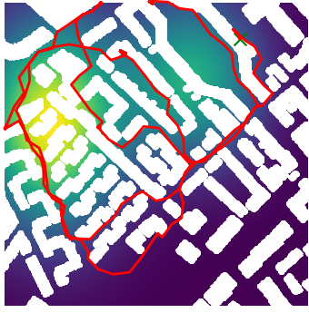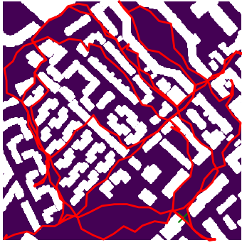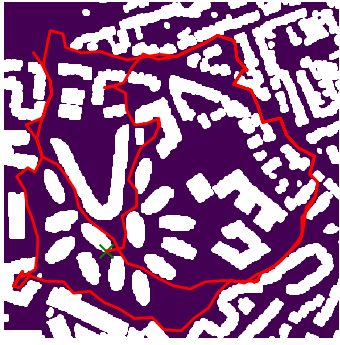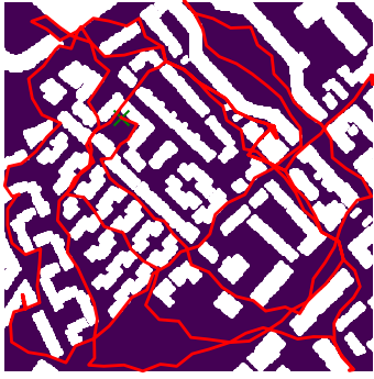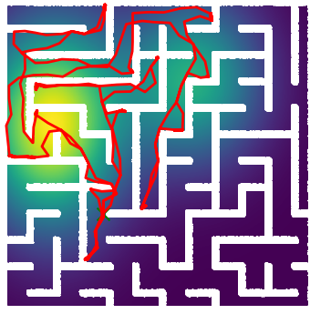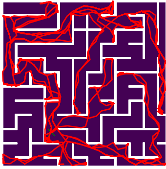 Here we demonstrate output trajectories given by GESCE when executed on MAPF benchmark maps referenced in Stern et. Al.. We use maps “Berlin_1_256”, “Boston_0_256”, “maze-32-32-4”, “maze-128-128-10” and “Paris_1_256” for their high clutter value. These maps are shown in Figure 1. Along with that, we use 5 information maps as shown in Figure 2. Then tests are conducted on the five aforementioned obstacle maps and information maps, performing five simulations for each scenario with randomly chosen starting locations. Resulting trajectories, marked in red, are shown in grid below in Figure 3,4,5,6 and 7. Each line indicates a different starting location for the robot.
